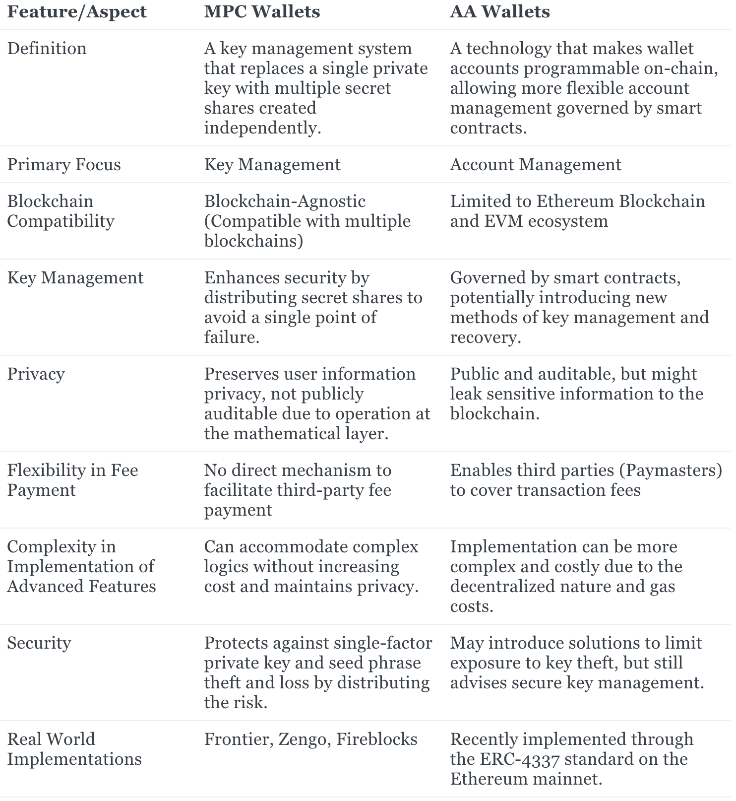 A cursory comparison of MPC and AA reveals that while they serve different primary purposes (key management for MPC and account management for AA), they possess complementary strengths. For instance, MPC, with its secure key management system, can work seamlessly with AA's flexible account management solutions, creating a robust and user-friendly crypto wallet ecosystem.