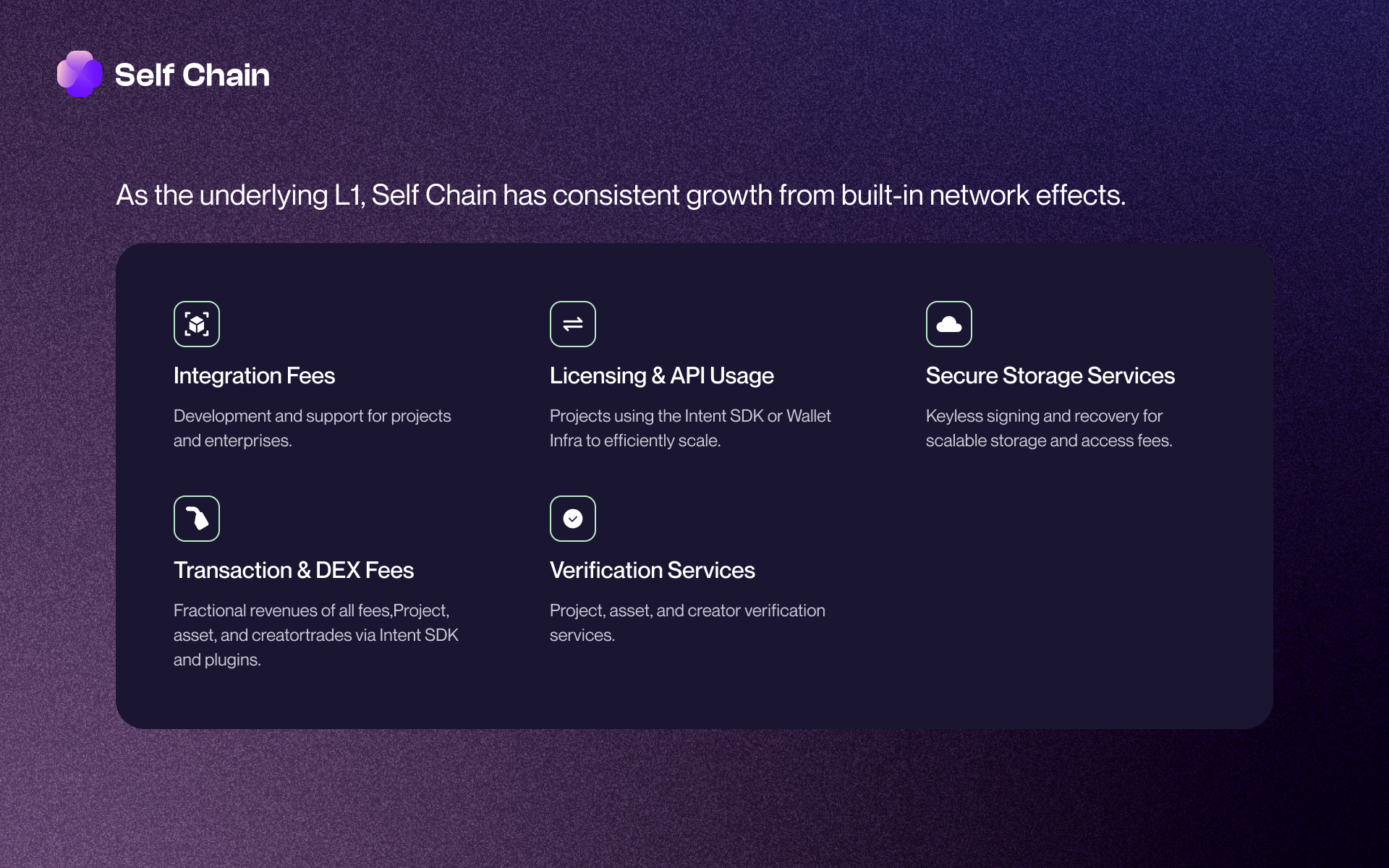 Projects utilizing Self Chain's Intent SDK or Wallet Infrastructure tap into a realm of possibilities. The licensing and API usage fees contribute to the sustainable growth of the ecosystem, ensuring that innovative projects can efficiently scale their operations while benefiting from the advanced features provided by Self Chain's cutting-edge technologies.